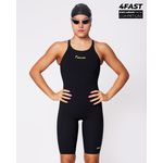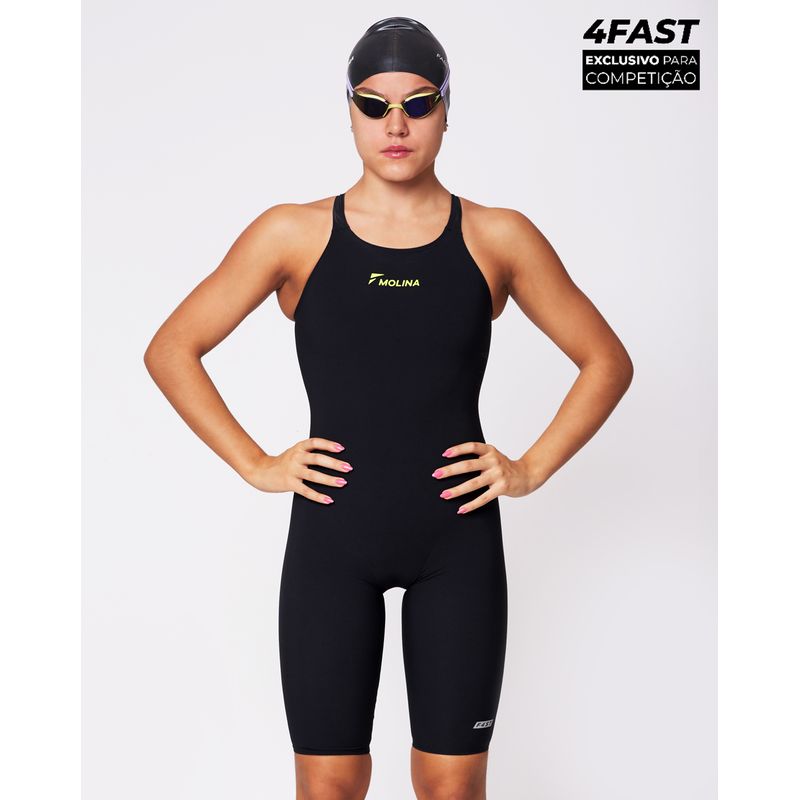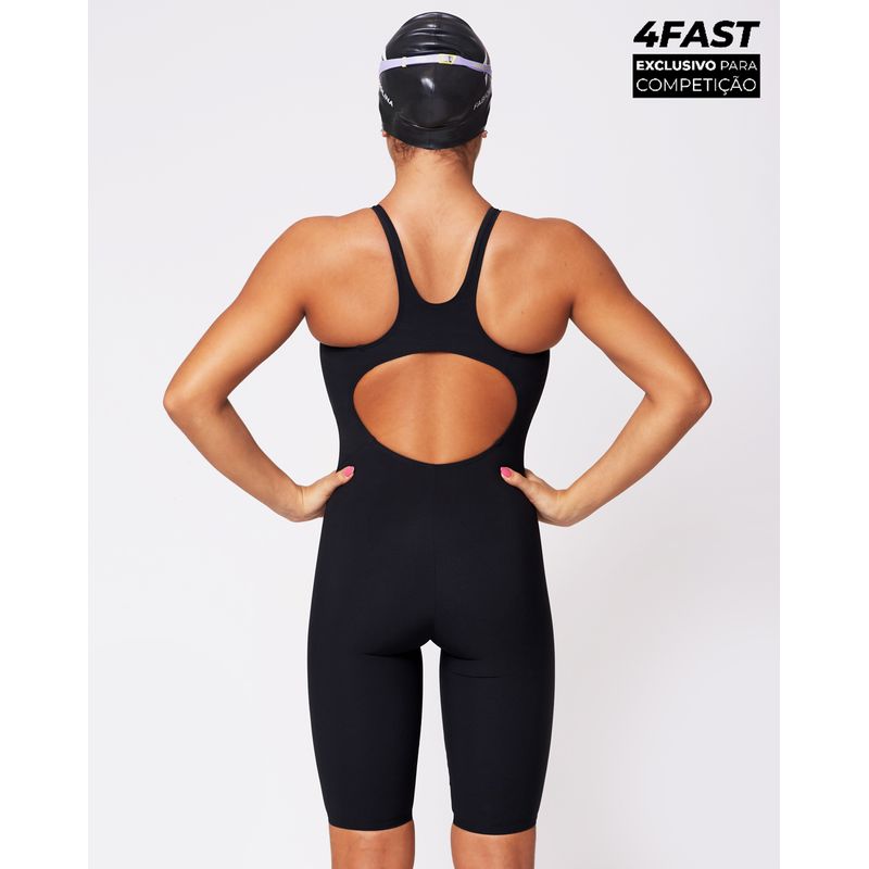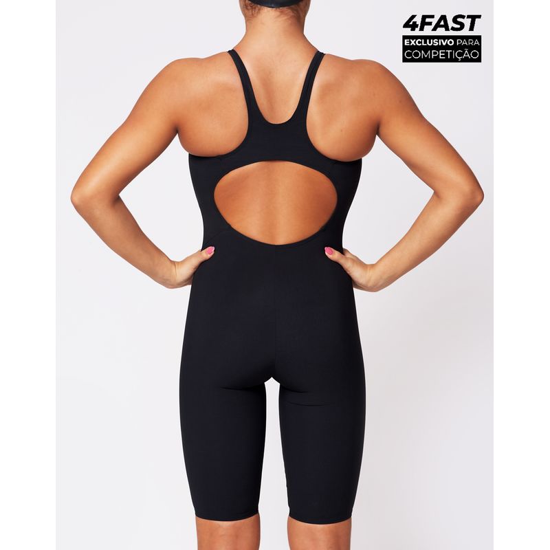 O Traje de competição 4Fast feminino alças largas e abertura oval nas costas possui modelagem muito apertada e ajuste perfeito ao corpo. Não possui forro, mas não fica transparente. O tecido é ultraleve, tem um toque macio, seca rápido e oferece um deslize perfeito na água. Não é indicado para treinos, somente para competição.